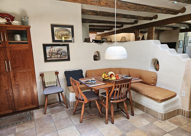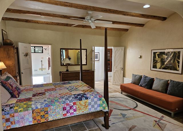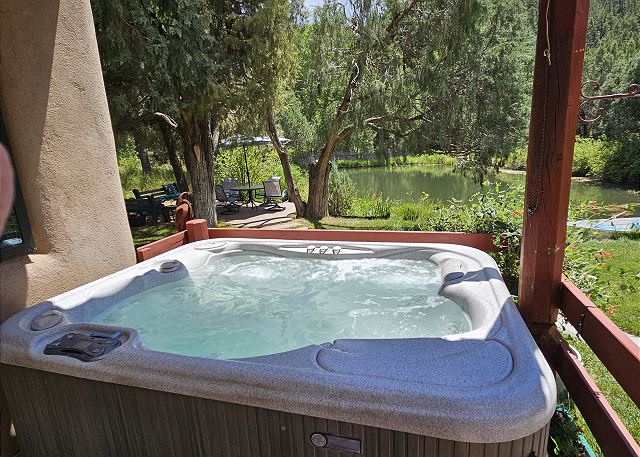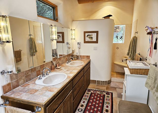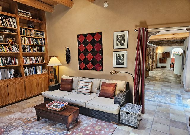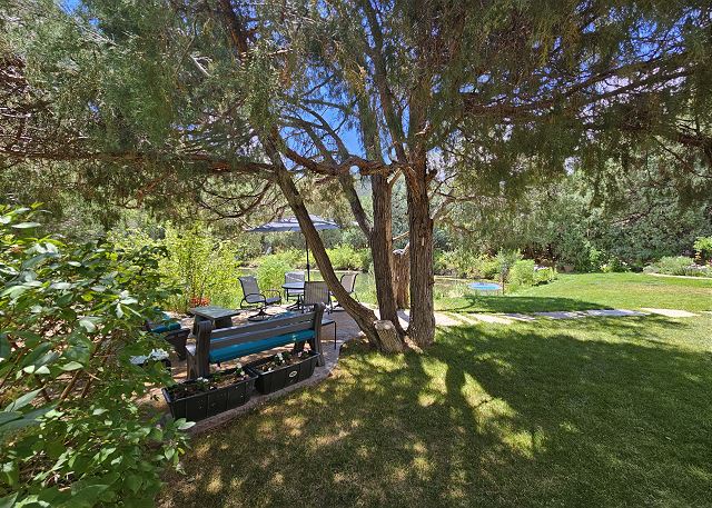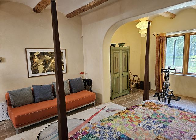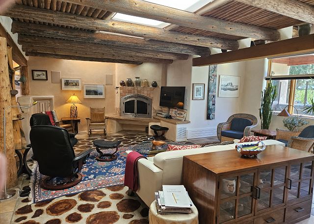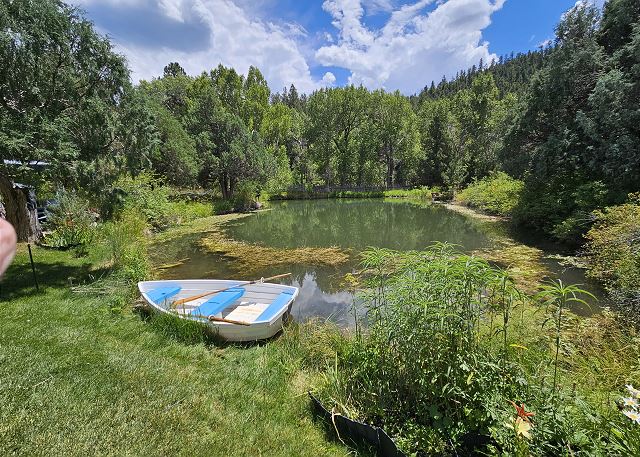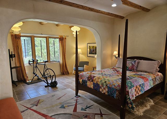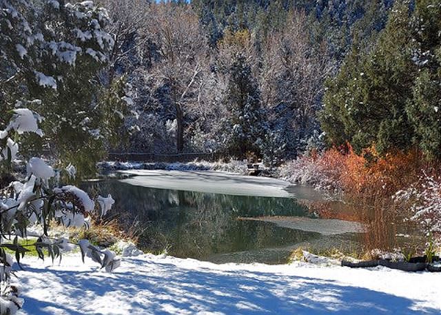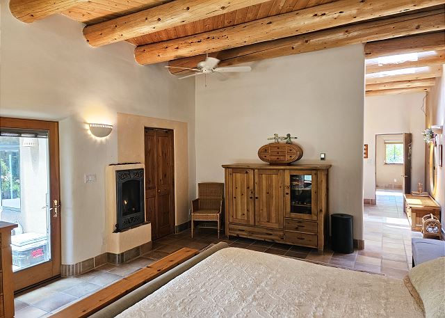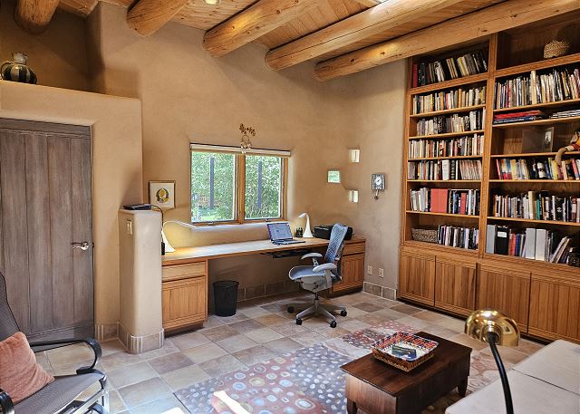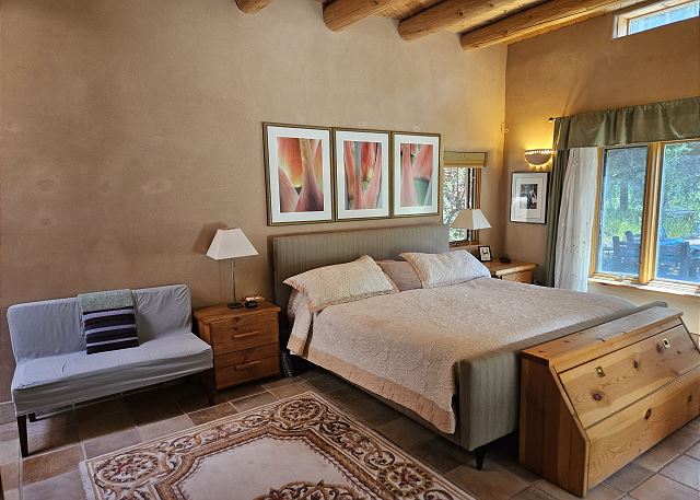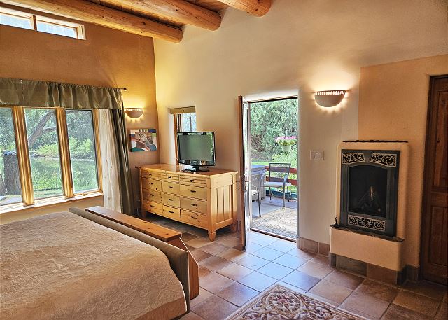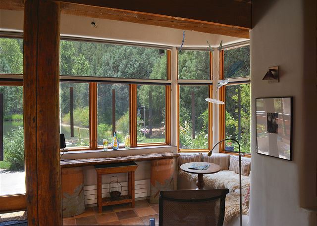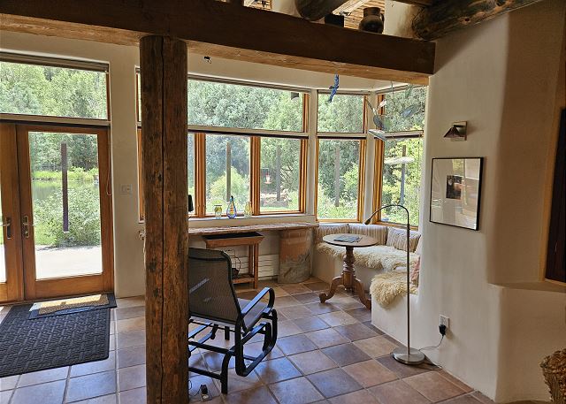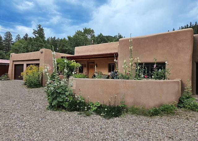 The 5 Star Main House is an elegant, authentic adobe house surrounded by junipers and native grasses, nestled in Taos Canyon on the scenic Enchanted Circle drive - yet only 5 miles from historic Taos Plaza. Truly a four-season experience, with vibrant spring and summer gardens, golden autumn cottonwoods, and snow-covered pines in winter. The 5 acre property has a private trail culminating in a canyon-view bench before it joins national forest. A rustic bridge crosses the Rio Fernando. A 1/3-acre pond reflects the landscape. There is a large desk in the library-office of the main house. The location is 18 miles to Angel Fire and 24 miles to Taos Ski Valley and is very convenient to hiking, biking, snow shoeing trails and all the shopping, dining and culture Taos has to offer. The beautiful outdoor setting has 2 furnished patios and 2 porches, hot tub and the backdrop of the Carson National Forest. There is a car port next to the Casita entrance and a single garage attached to the main house plus ample parking. Radiant and wall heated. Saltillo and Italian stone tile flooring, large kiva and tile wood burning fireplaces plus one bedroom with a gas burning fireplace. Generous skylights set between high ponderosa ceiling vigas accent the softly curved mud plaster walls. Washer/dryer, iron and ironing board are on the premises. Thick adobe walls, trees, and cross ventilation keep it naturally cool in summer.