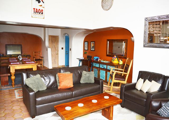 Come and stay in a true southwest adobe home. Experience viga ceilings, kiva fireplace, nichos and bancos, mountain views and more and see what everyone is talking about when they arrive home from Taos, NM. The house also features fast Internet access with Wifi and 2 43" smart TVs.